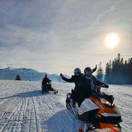 Mach dich dann auf eine adrenalingeladene Schneemobilfahrt durch die verschneiten Berge gefasst