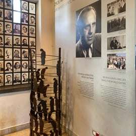 Onze reis eindigt met een reflectie op de levende overlevenden van Oskar Schindler voor de ingang van de voormalige Schindlerfabriek. (museum novadag).